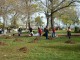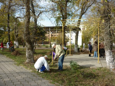 Преподаватели детской музыкальной школы №1 убирают опавшую листву с газонов и тротуаров.