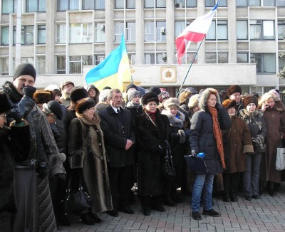 Несмотря на холодную погоду, перед зданием исполкома, где был установлен большой экран, собрались сотни керчан. Среди присутствующих были чиновники исполкома, представители партийных и общественных организаций, ветераны, рабочие, студенты и школьники.
