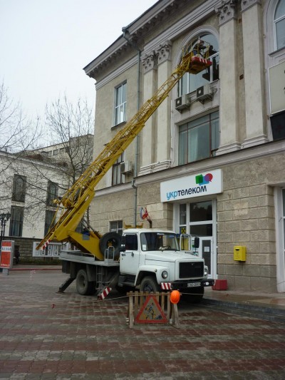 Для того, чтобы вымыть окна в здании главпочтампта вызвали машину с подъемником