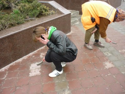 Пантеон Славы в центре Керчи обновили. Что бы убрать следы строительства, разлитую краску, остатки цементного раствора, рабочие щетками чистят каждую плитку.