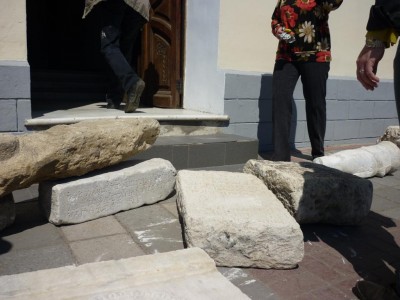 Перед зданием музея древностей, на тротуаре лежали древние плиты и фрагменты архитектурных форм. Рабочие заносили их в помещение музея.