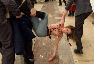По сообщениям российских СМИ, инцидент произошел на избирательном участке в здании Российской академии наук в Москве, где в воскресенье голосовал кандидат в президенты Владимир Путин: три девушки разделись до пояса и стали скандировать антиправительственные лозунги.